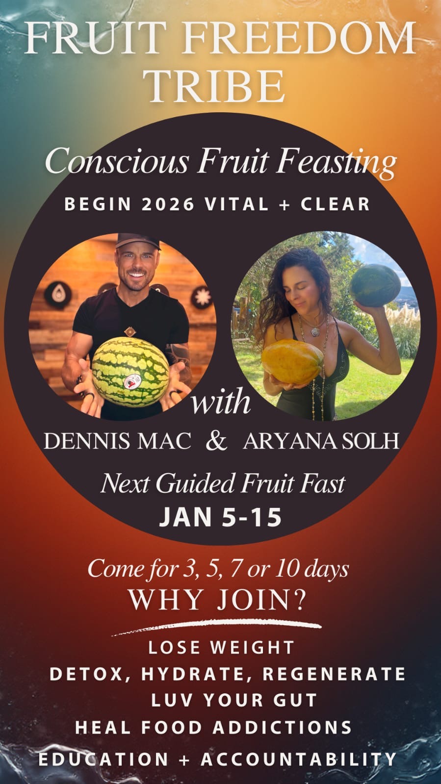 Get ready for a guided fruit feast experience with strategic protocol and intention setting. You will receive daily support and inspiration with live Zoom calls to help with cellular detoxification, weight loss, digestive rest and renewed energy that builds eternal vitality.